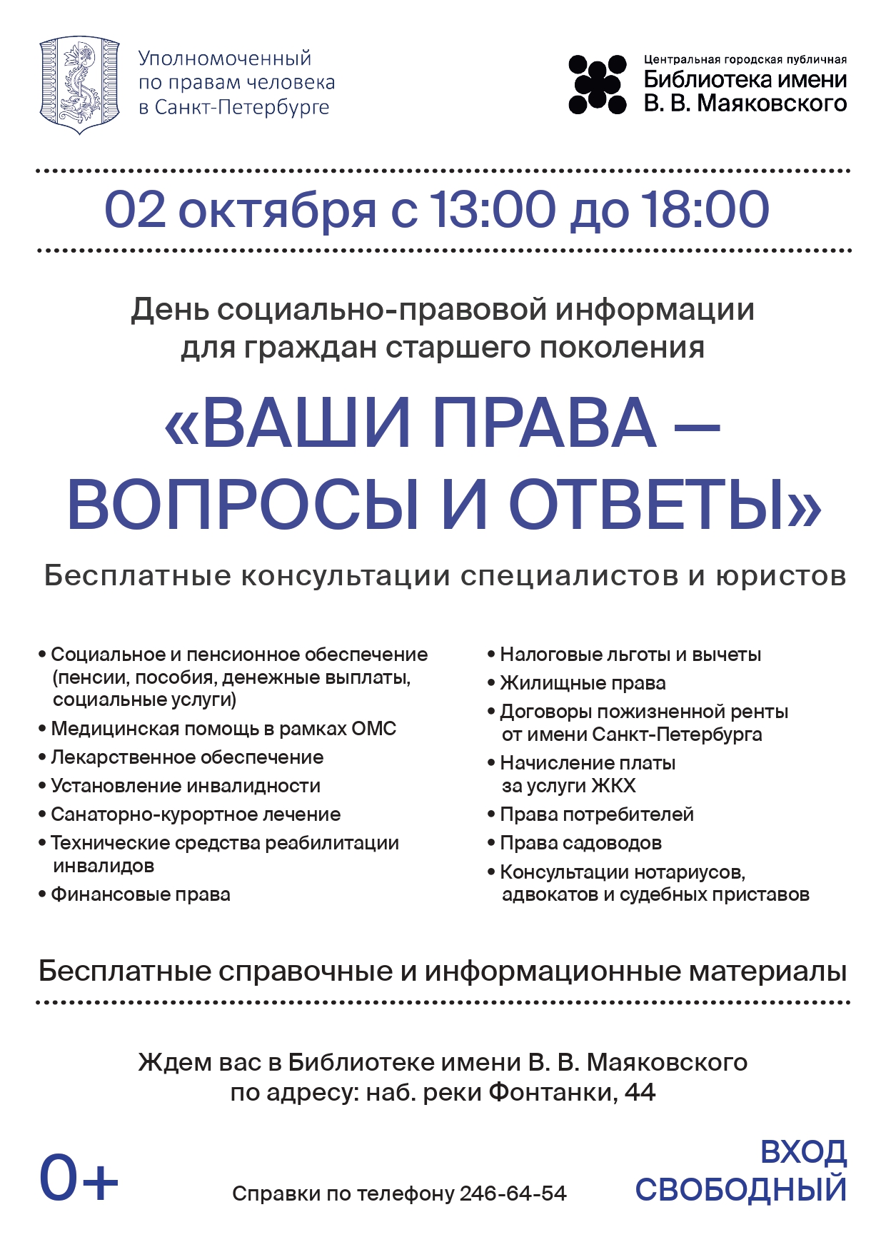В этот день Уполномоченный по правам человека в Санкт-Петербурге совместно с Центральной городской публичной библиотекой им. В. В. Маяковского приглашают петербуржцев старшего поколения посетить мероприятие и получить индивидуальные консультации у специалистов и юристов.