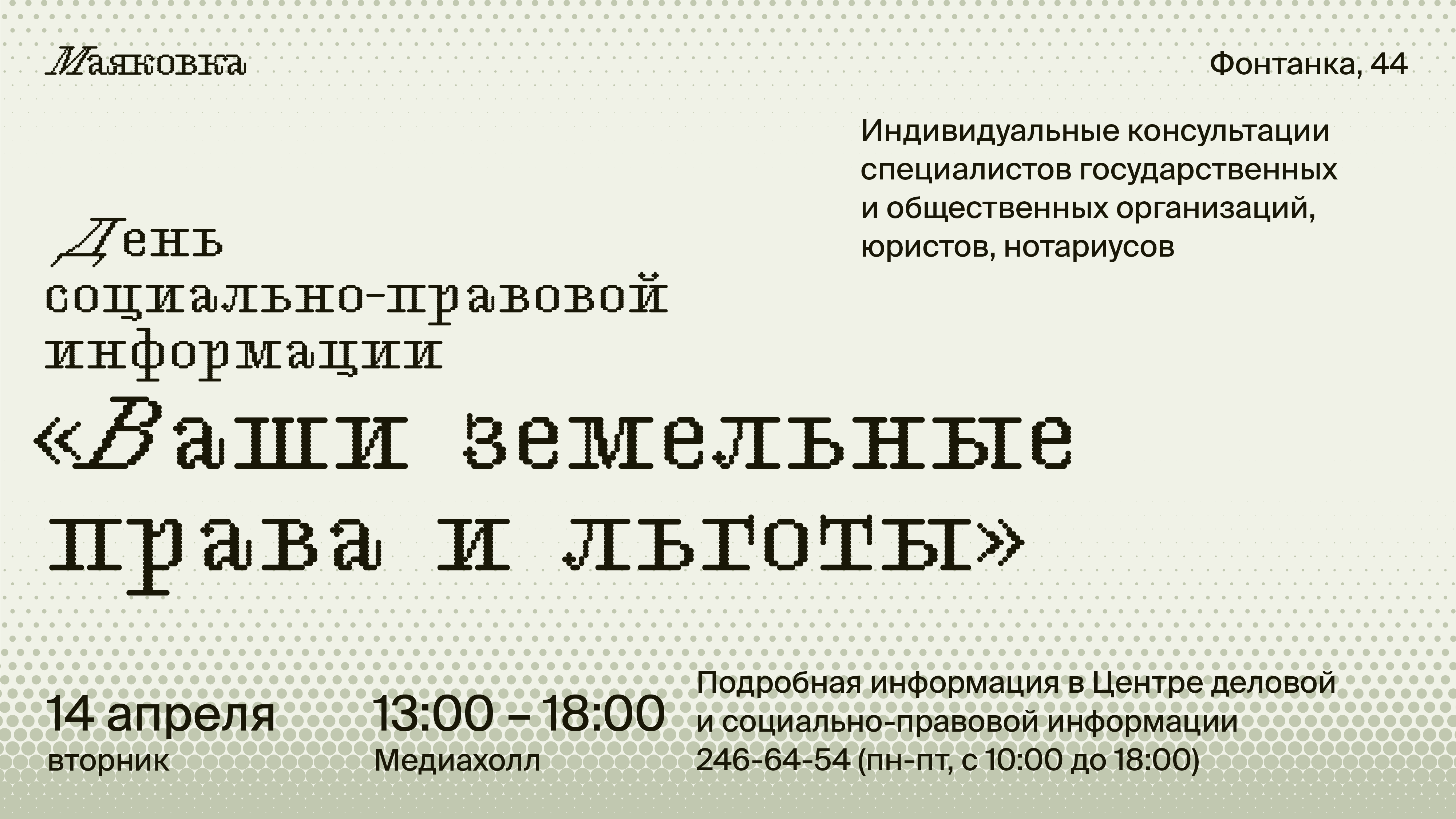Получить ответы на эти и другие вопросы можно будет 14 апреля с 13.00 до 18.00 на Дне социально-правовой информации в Библиотеке им. В. В. Маяковского по адресу: набережная реки Фонтанки, 44 (1-й этаж, Медиахолл).