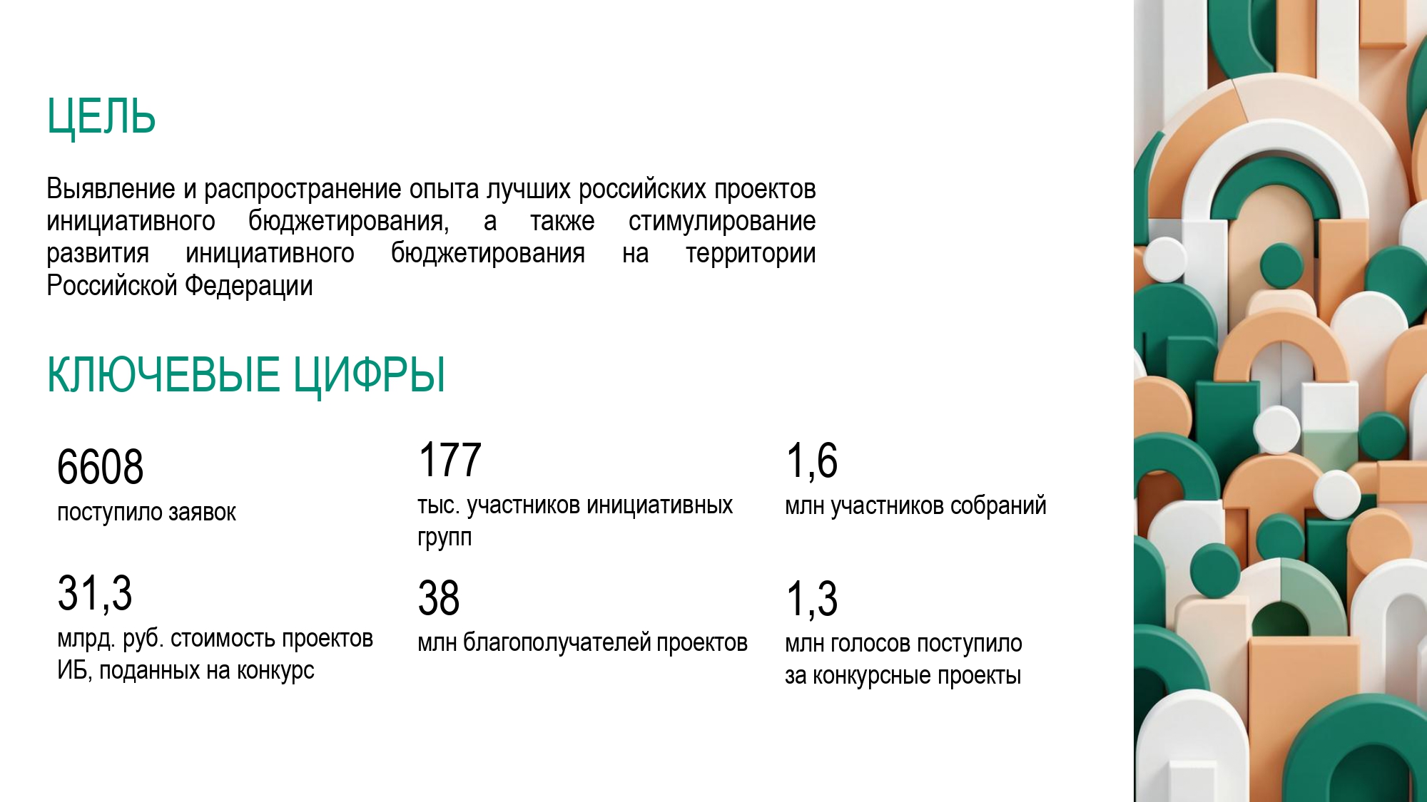 Целью конкурса является выявление и распространение опыта лучших российских проектов инициативного бюджетирования, обобщения опыта. На конкурс могут подаваться проекты, реализованные в 2025 году.