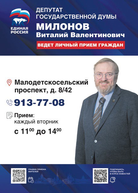 Обсудить волнующие вас вопросы с Виталием Милоновым можно в Общественной приемной партии «Единая Россия» в Адмиралтейском районе (Малодетскосельский пр., д. 8/42).