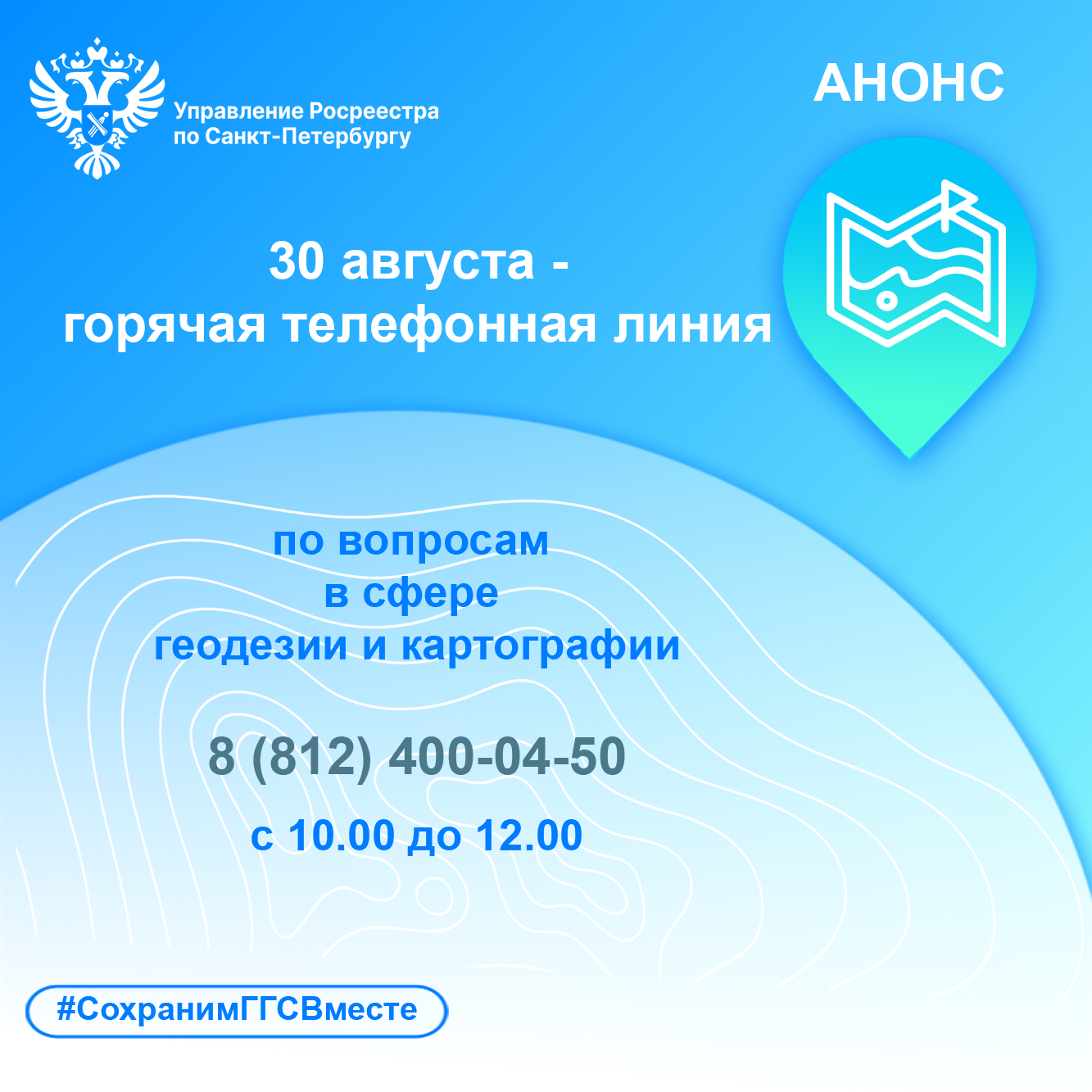 30 августа 2024 года с 10.00 до 12.00 часов Управление Росреестра по Санкт-Петербургу проводит горячую телефонную линию по вопросам в сфере геодезии и картографии.