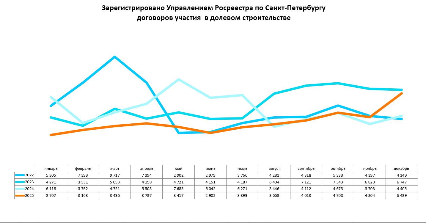 Общее количество зарегистрированных в 2025 договоров участия в долевом строительстве 45 948 (в декабре 2025 года – 6 439, рост в сравнении с ноябрем – 50%).