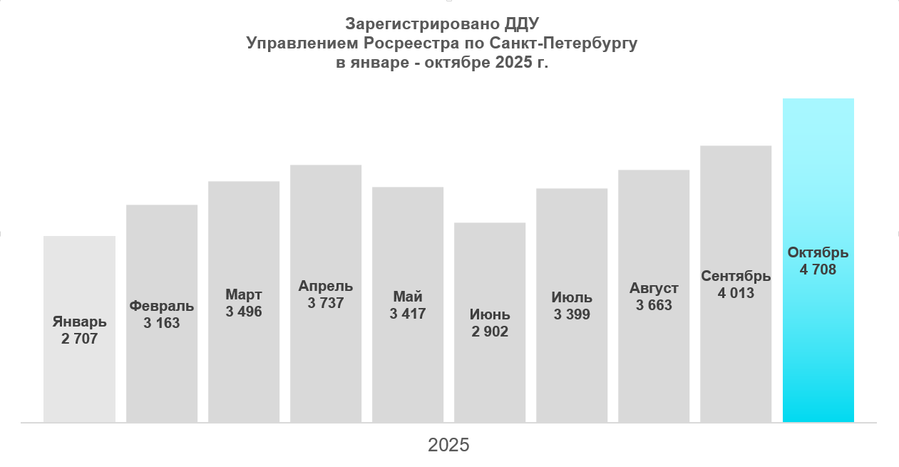 Общее количество зарегистрированных в октябре 2025 года договоров участия в долевом строительстве – 4 708, что стало годовым максимумом. Всего за 10 месяцев зарегистрировано 35 205 ДДУ.