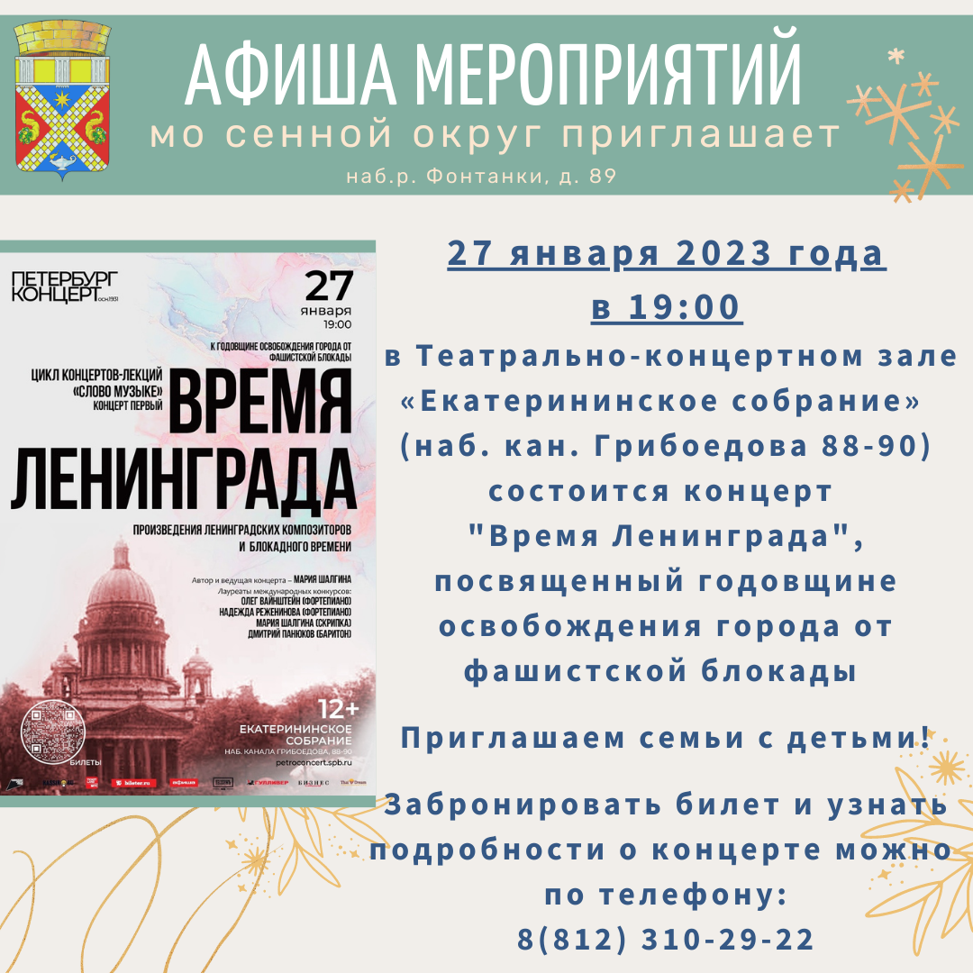 Приглашаем семьи с детьми в Театрально-концертный зал «Екатерининское собрание» (наб. кан. Грибоедова 88-90), где 27 января в 19.00 состоится концерт «Время Ленинграда» - первый из цикла концертов-лекций «Слово музыке». Программа посвящена годовщине освобождения Ленинграда от фашистской блокады.